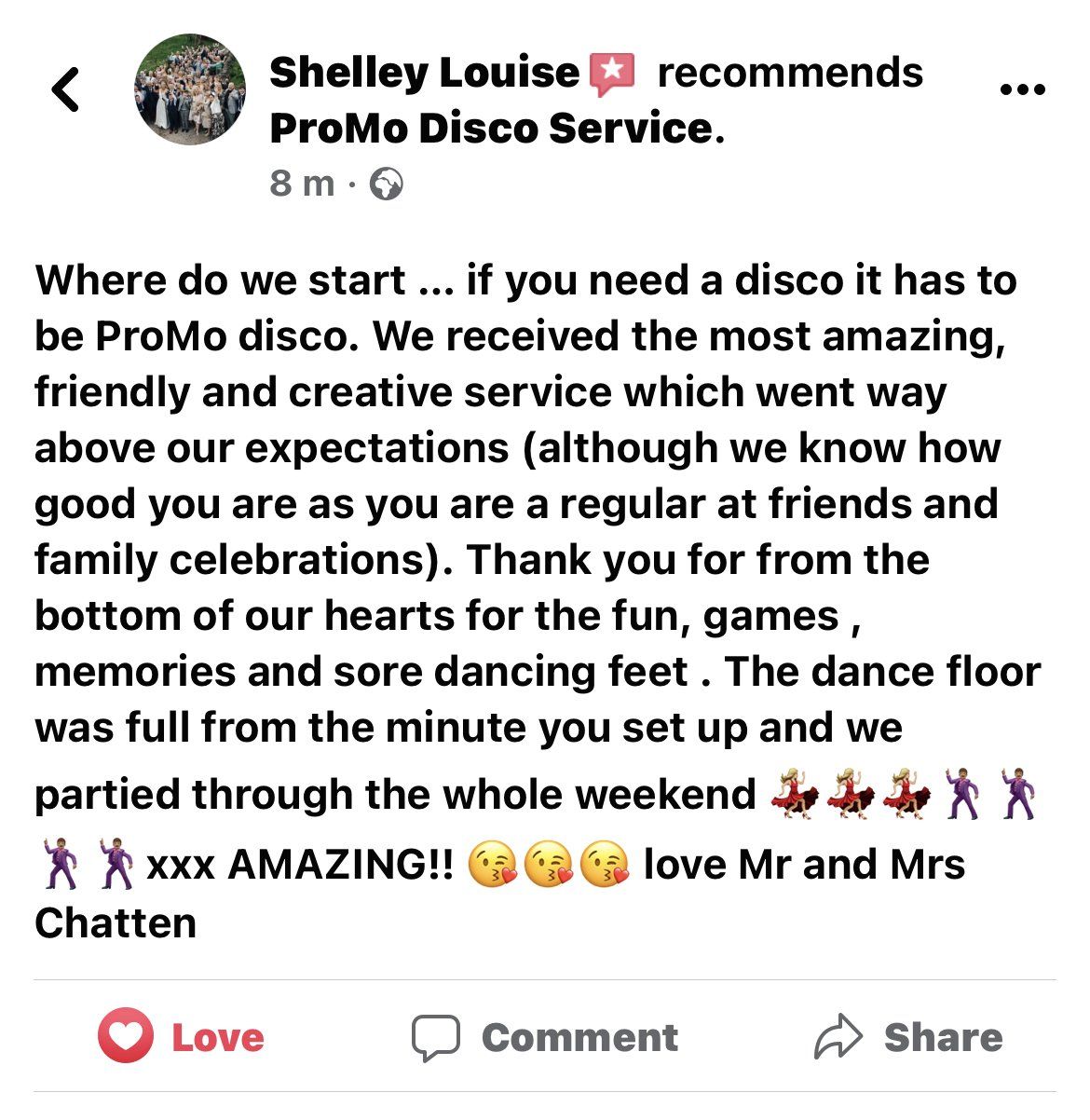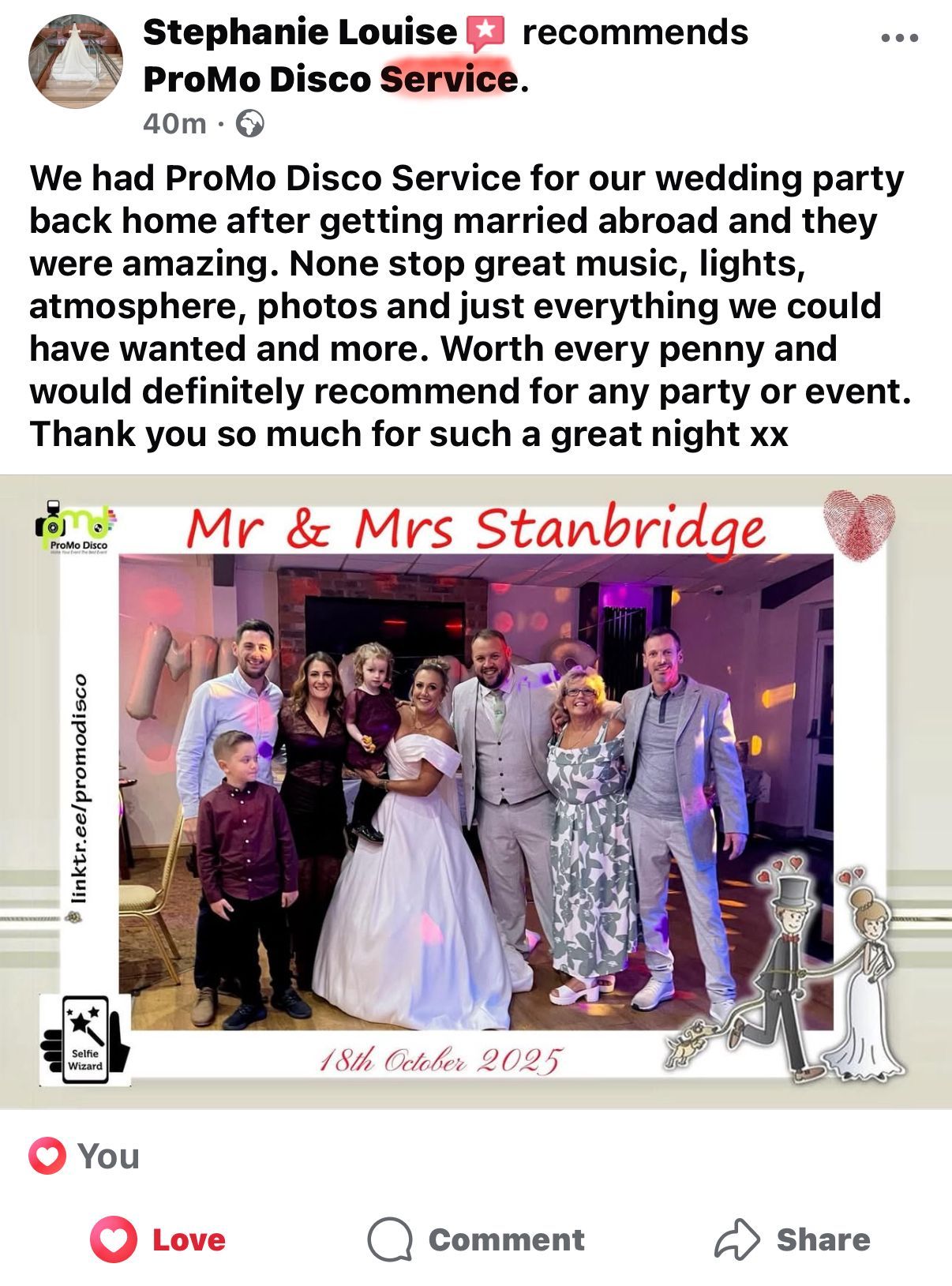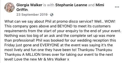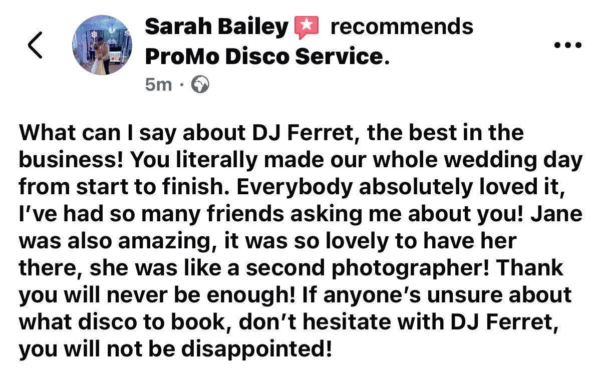 Quotations for mobile discos can vary considerably as can the packages and services that they provide. Unfortunately there are a lot of people who see running a mobile disco as an easy way to have a bit of fun and earn a bit of money. Cheap prices normally indicate that they haven’t got the experience and k nowledge in the services they provide to charge a realistic price. The costs involved in organizing your wedding reception (or any other sort of event function or party) will always be considerable. It’s worth taking into account when budgeting for your event, what proportion of it you should allocate to the entertainment. Your DJ will play one of the biggest parts in ensuring that your event is a pleasurable and memorable experience ( please check out our feedback, comments and review's from past parties on our facebook page ) www.facebook.com/promodiscoservice